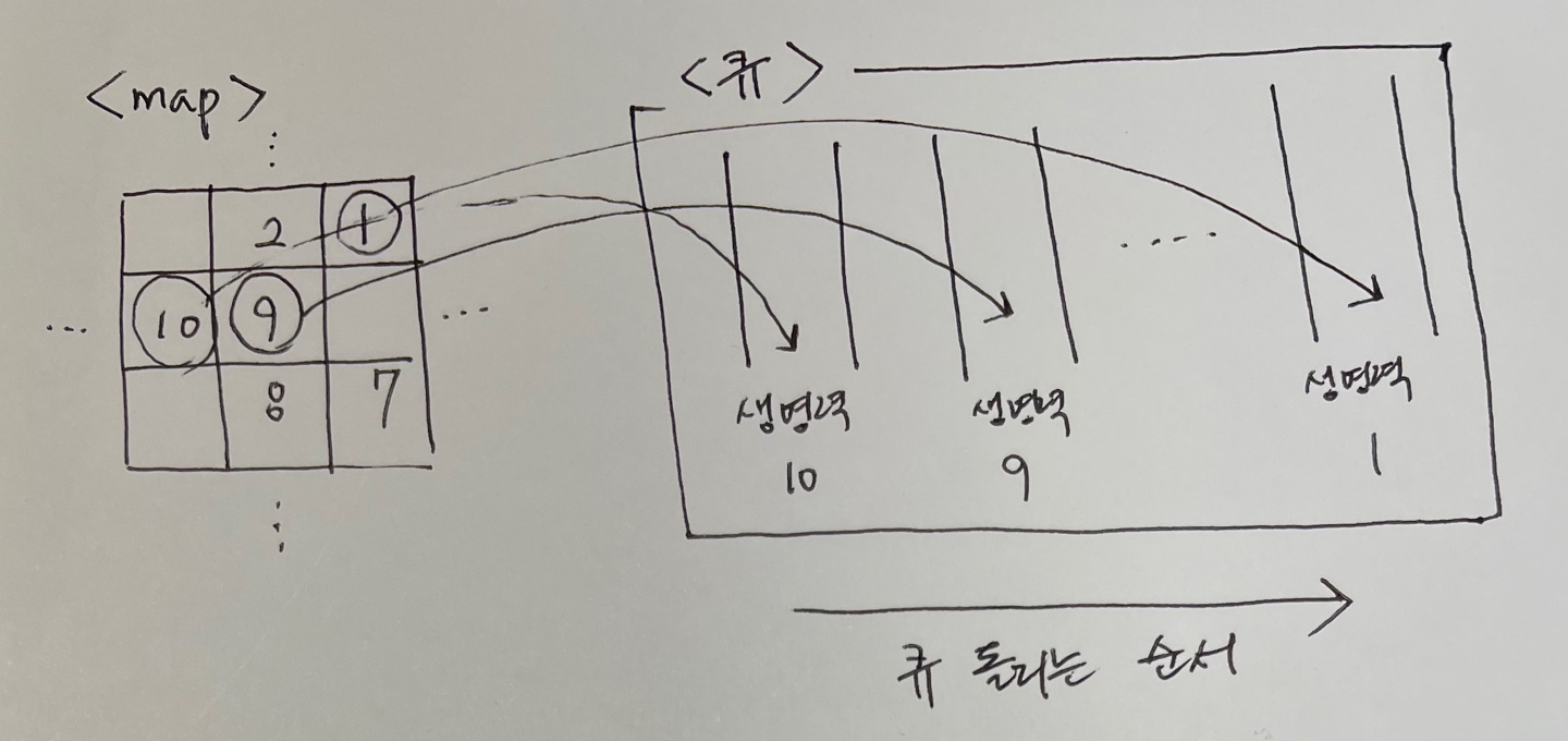 => 저는 이걸 읽고, '단순히 큐에 넣고, 돌리는 방법만으로는 안된다.' 라는 생각을 하였습니다. 왜냐하면, 세포 간 우선순위가 존재하기 때문입니다. 저는 세포 생명력에 따라 큐 배열을 만들었고(생명력 최대치가 10이기 때문), 생명력이 높은 세포 큐부터 탐색을 진행해서 생명력이 높은 세포가 먼저 자리를 차지할 수 있도록 하였습니다.