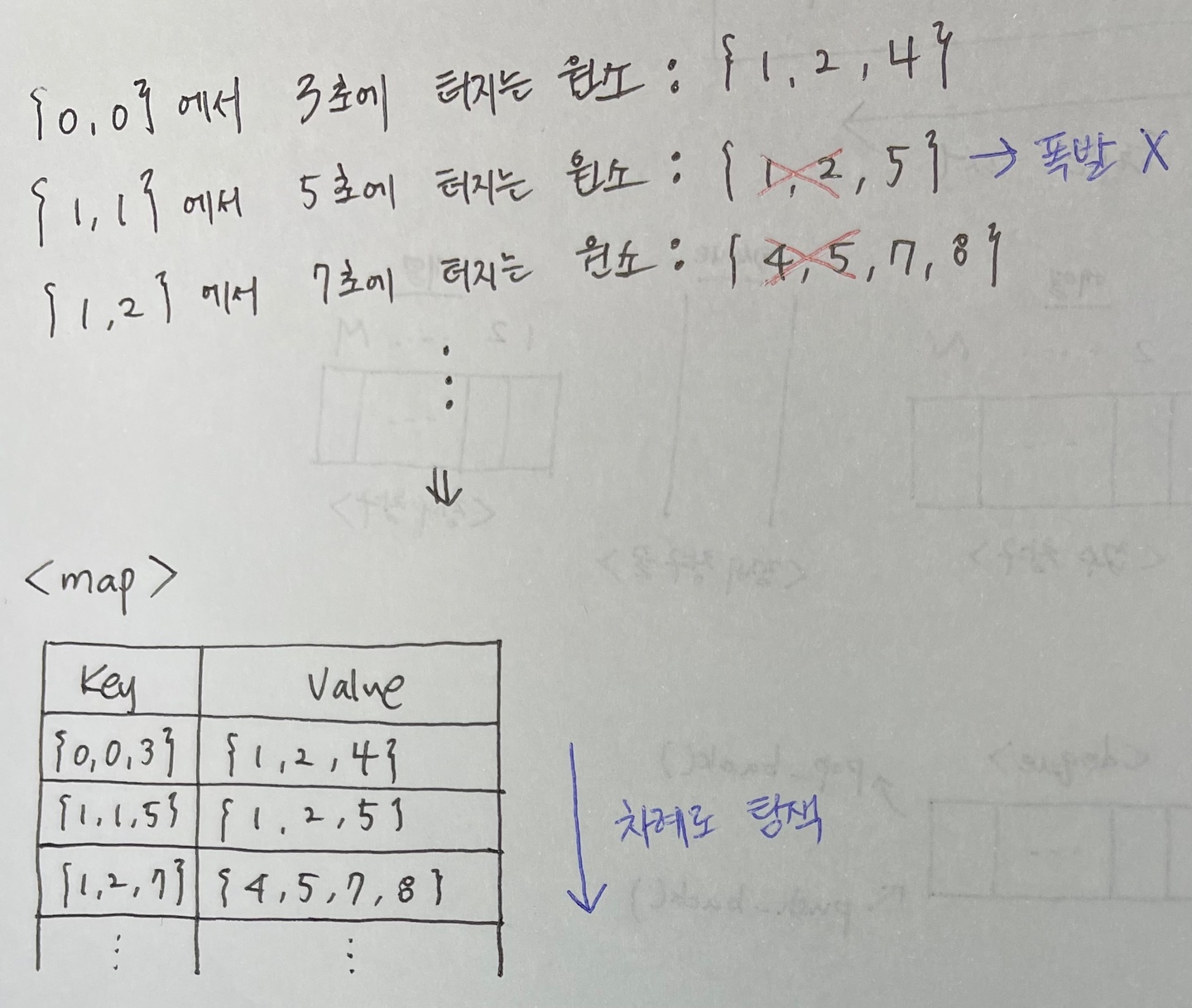 ③ 같은 시간에 같은 좌표에서 충돌하는 원소들끼리 모은다.