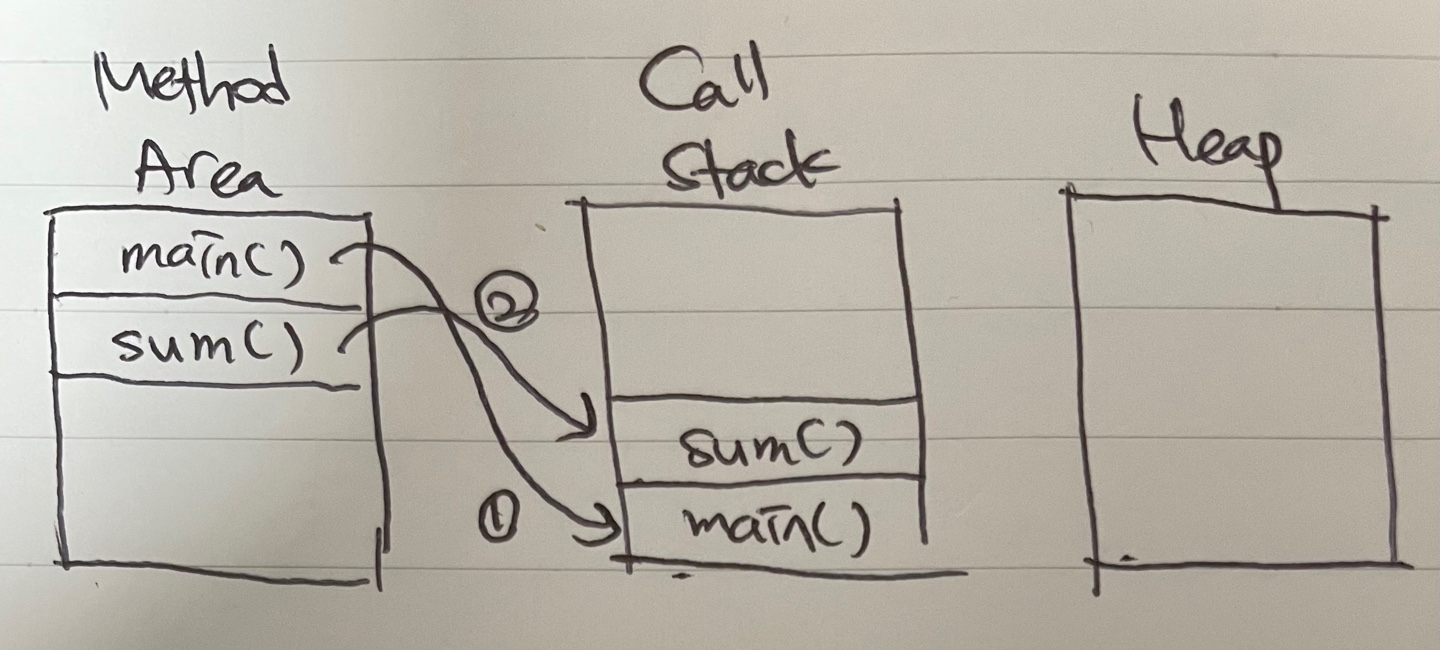 ① 메서드가 호출되면 기계어 코드를 할당받고 메서드가 실행되는 메모리 공간