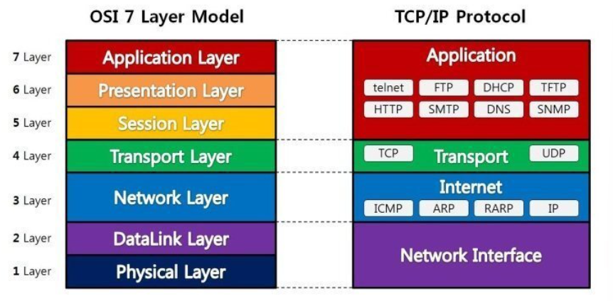 - 4계층(트랜스포트 계층) : 데이터를 어떻게 전달할지 정하는 계층. 대표적으로 TCP, UDP가 있는데 TCP는 데이터의 신뢰성을 보장하는 프로토콜이고 UDP는 신뢰성을 보장하지 않음