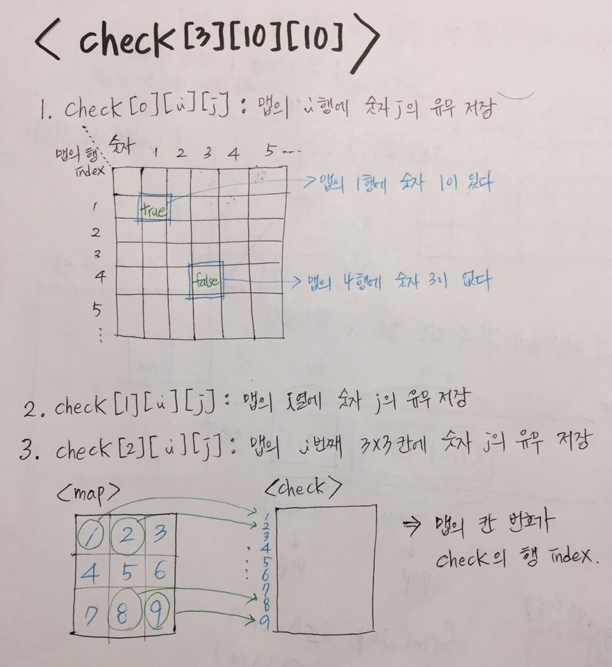//각각의 행,열,3X3칸에 대해 1~9숫자가 있는지 판별