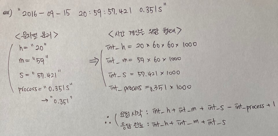 1. 주어진 문자열을 통해 '요청 시작 시간'과 '처리 완료 시간'을 분리합니다.