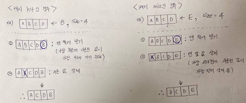 => 저는 deque를 이용하여 캐시를 구현하였습니다. 또한 가장 오래전에 사용된 값은 덱의 맨 앞에, 가장 최근에 사용된 값은 덱의 맨 뒤에 저장하였습니다. 덱을 사용한 이유는, 교체될 덱의 맨 앞의 값을 pop_front() 함수를 써서 쉽게 빼기 위함입니다.