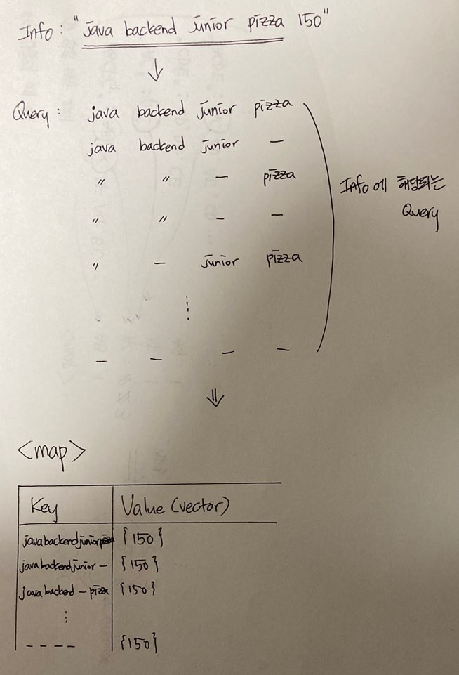 위와 같이 정리를 해놓고, 해당 쿼리마다 만족되는 점수들의 개수를 구합니다. 만족되는 점수들의 개수를 구할 때, 점수들을 정렬해놓고 이분탐색을 이용하면 더 빠르게 찾을 수 있습니다.